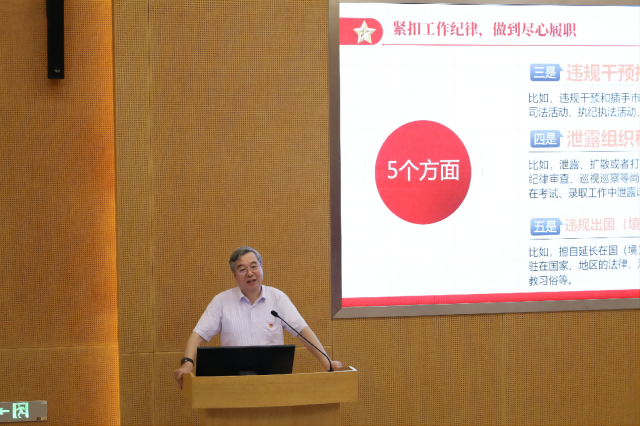 6月19日下午,副校长孔令义在江宁校区经管文楼111报告厅为21点游戏下载 作《紧扣“六大纪律”,推动党纪学习教育走深走实》的专题党课。21点游戏下载 教职工党员参加学习。