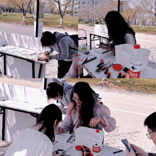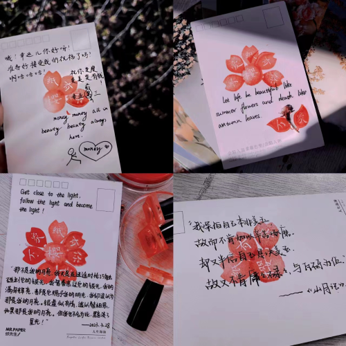 落樱烂漫几多时,樱霞晚钟予万象。参与活动的各位同学手持明信片走进樱花苑,以文字的力量向与自己交换明信片的陌生人传递温暖。或是一句真挚的祝福,或是一段优美的诗句,或是一句富有哲理的名言,这些生动的文字流于笔尖,跃然纸上,犹如一道光驱散了凛冬,带着春日的和煦和温暖来到了陌生的彼此手中,为同学们的校园生活增添了一份诗意的浪漫。同学们通过赏樱花、写祝福、换心意等一系列活动集齐“只因有你,爱予万象”的盖章,温暖彼此,在春日校园中寻找快乐。