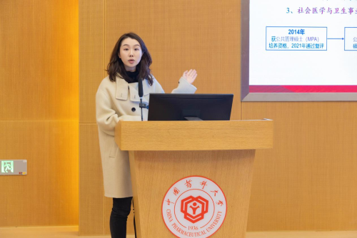 唐文熙教授从公共管理学科国内外发展现状、近年来的建设举措以及未来的建设计划三个方面详细介绍,她指出,当下如何依托我校药学特色进行交叉融合型发展,发扬学科特色与夯实学科建设基础是关键,将持续加强学科建设,助力公共管理学科建设迈上新台阶。